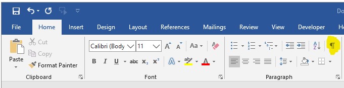 Click the paragraph mark in the Paragraph grouping, highlighted above. This will show spaces as dots between the words, tabs as arrows and paragraph marks as backward P. Clicking the paragraph mark acts like a switch, click to turn on or off.