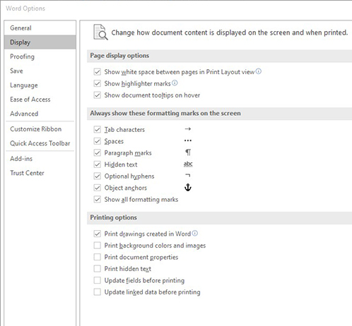 Go to File tab and choose Options at the bottom of the list on the right. Select Display and the Check the boxes for the formatting boxes you want to see or choose "Show all formatting marks."
