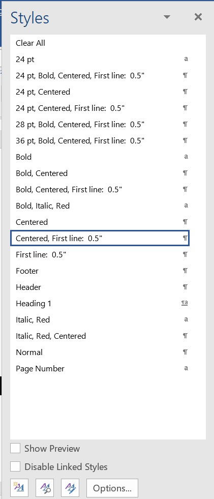 It is hard to remember individual styles to apply when you are concentrating on writing the story. In this example, the writer has chapter heads in 24, 28 and 36 point, some centered, some bolded. This is time consuming to standardize and impossible for an editor to know how the author really intended the chapter heads to appear.