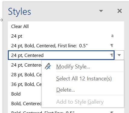 If you did not use styles from the start of your project, you can still convert your document to use them. Right click on one of the styles to convert and choose Select All __ Instance(s)