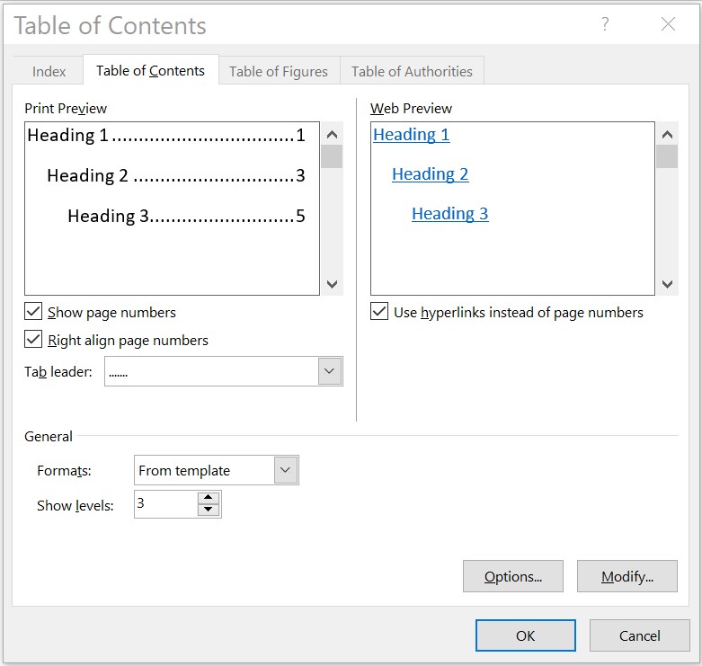 Choosing Options allows you to select what styles will be included in the table of contents and Modify allows you to style the table.